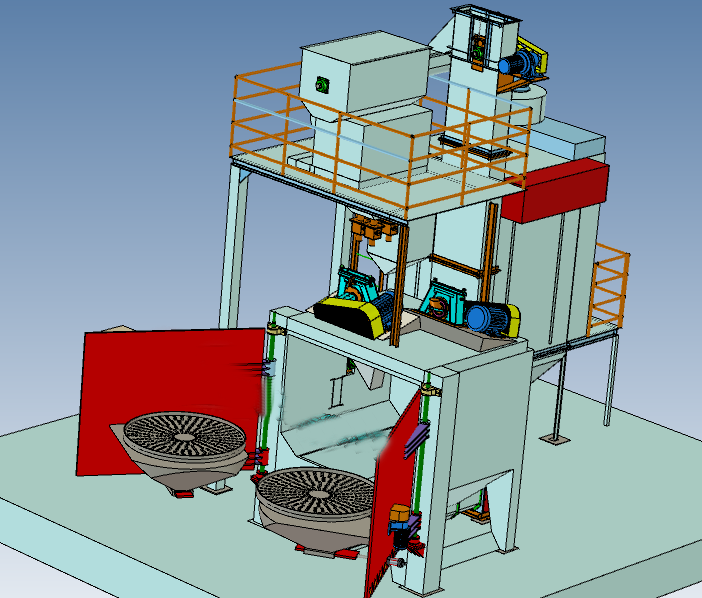 兩根并行的轉(zhuǎn)動(dòng)輥,將彈簧放在上面,旋轉(zhuǎn)通過拋丸區(qū)域,靠頂部固定的拋丸器對(duì)彈簧表面做拋丸處理。該種拋丸方式連續(xù)性強(qiáng),一段上件一段下件,流水性作業(yè),效率高。