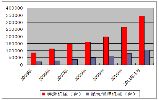 2005年我國(guó)拋丸機(jī)產(chǎn)量為22789臺(tái)套,截至20118月末,我國(guó)拋丸機(jī)產(chǎn)量已達(dá)110000臺(tái)套,年均增長(zhǎng)26%。