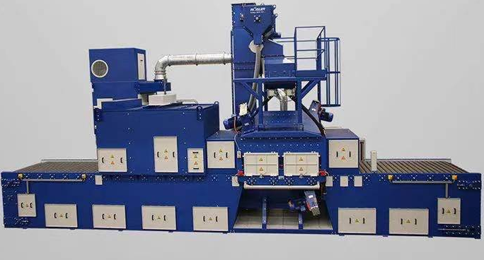 鋼板拋丸機(jī)是多數(shù)板材軋鋼廠必備的基礎(chǔ)設(shè)備,現(xiàn)在使用的都是輥道式鋼板拋丸機(jī),它將不同厚度的一張張鋼板連續(xù)自動(dòng)的進(jìn)行表面潔凈處理,然后按照客戶要求進(jìn)一步熱處理或防腐處理。鋼板拋丸機(jī)通過(guò)高速旋轉(zhuǎn)的拋頭葉輪將鋼丸以高速度拋投到鋼板表面,擊打磨削鋼板表面。拋頭分布在鋼板運(yùn)輸輥道上下兩側(cè),錯(cuò)落放置。根據(jù)鋼板寬度的不同上下兩側(cè)的拋頭也不相同,同時(shí)調(diào)節(jié)鋼板在輥道上的傳輸速度和控制拋頭的鋼丸量,能對(duì)移動(dòng)中的鋼板進(jìn)行完美的拋丸處理。