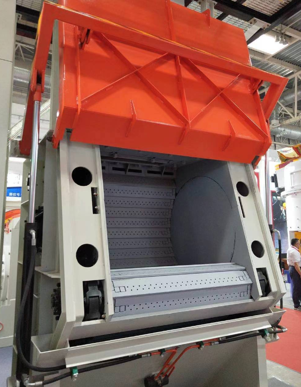 第五步:將履帶放入到清理室中,對于比較大的履帶可以使用室體頂部開眼,用鋼絲穿入懸吊的方式安裝,也可以在拋丸器葉輪位置固定一個手拉葫蘆來拉動履帶。