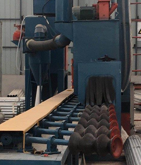 拋丸器選用向上拋丸安置。因為管徑不一樣鋼管在輥道上運送時其底面大致處于一樣的高度,拋丸器從下向上拋射,彈丸到鋼管外表的距離根本一樣,鋼丸抵達工件外表的拋射速度一樣,確保不一樣管徑的鋼管對外表的整理作用都一樣。為后續(xù)的噴涂供給一樣的條件。