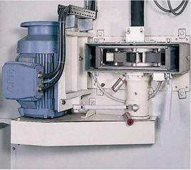 拋丸器中的雙圓盤鉚接成一體,構(gòu)成葉輪體。葉輪體上裝有八片葉片,葉輪體與位于拋丸輪中心的分丸輪一起裝在由電動(dòng)機(jī)驅(qū)動(dòng)的主軸上。罩內(nèi)襯有護(hù)板,罩殼上裝有定向套及進(jìn)丸管。工作時(shí),彈丸由進(jìn)丸管流入拋丸器。跟葉片作同步旋轉(zhuǎn)的分丸輪使彈丸得到初速度。彈丸經(jīng)定向套的窗口飛出,拋到定向套外面的高速旋轉(zhuǎn)的葉片上,被葉片進(jìn)一步加速后,拋射到被清理工件的表面上。因?yàn)榉滞栎喓腿~片作同步旋轉(zhuǎn)保證了彈丸向葉片的無振動(dòng)傳遞,從而減小了對葉片的磨損。
